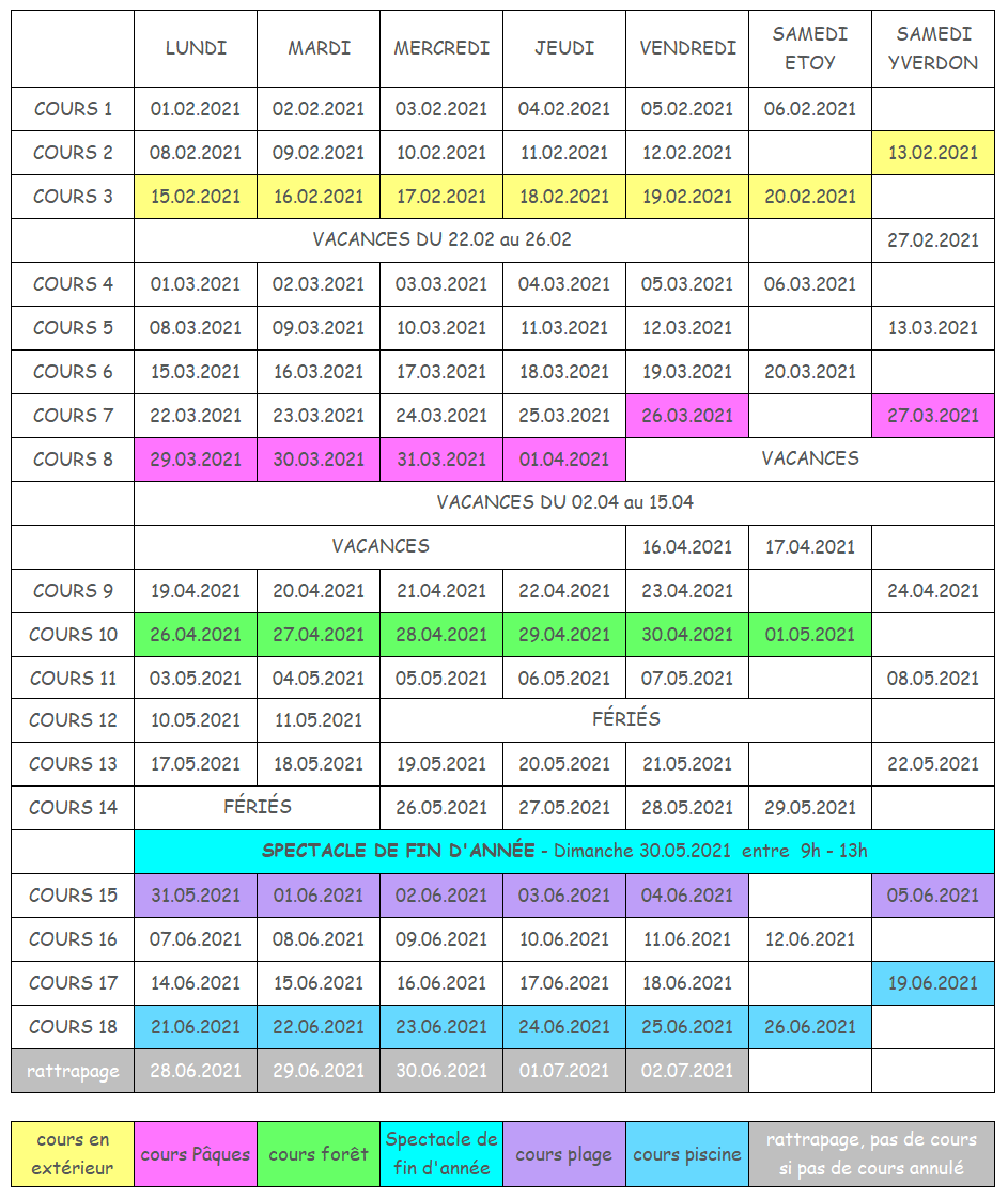 CALENDRIER DES COURS FÉVRIER – JUIN 2021