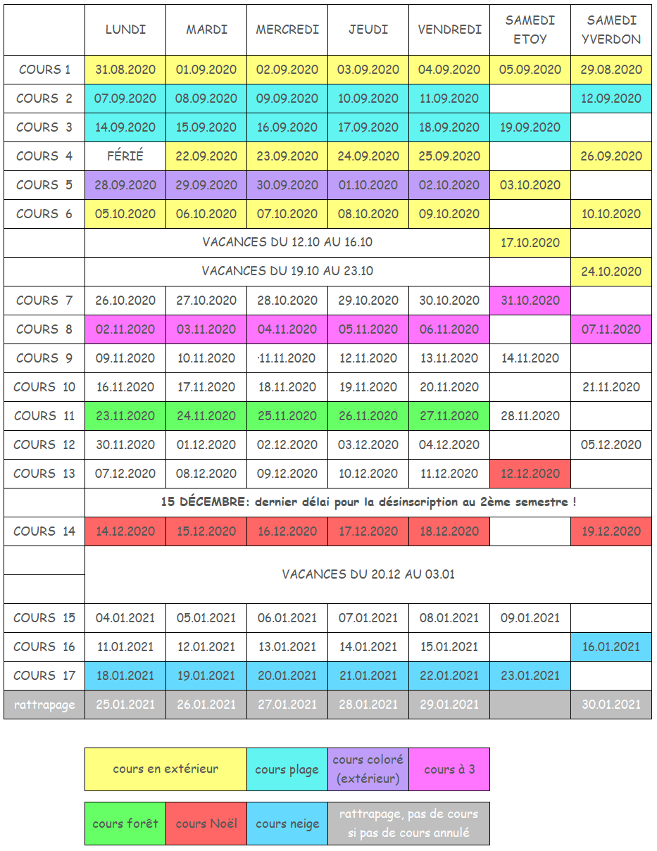 CALENDRIER DES COURS SEPTEMBRE 2020 – JANVIER 2021