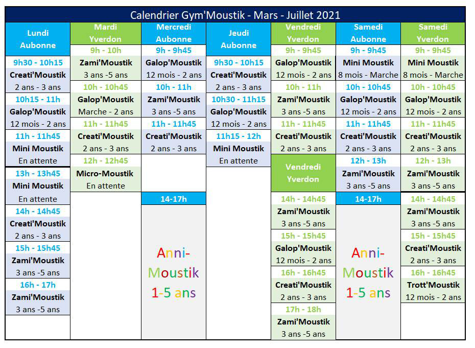 Sauf indication contraire, les cours sont hebdomadaires et durent 45 minutes.